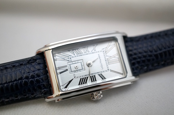 穏やかにラウンドしたスクエアケース、アールデコを基調としたローマン文字盤、特徴的なレイルロードパターンとリーフ針。