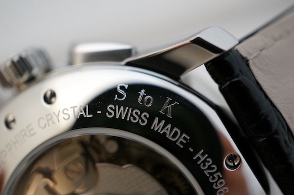 特別なお祝いと記念にランドホーの特別な刻印サービスもご指定いただき世界で一つだけのジャズマスターオートクロノの完成です。