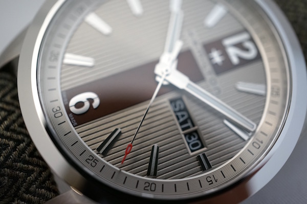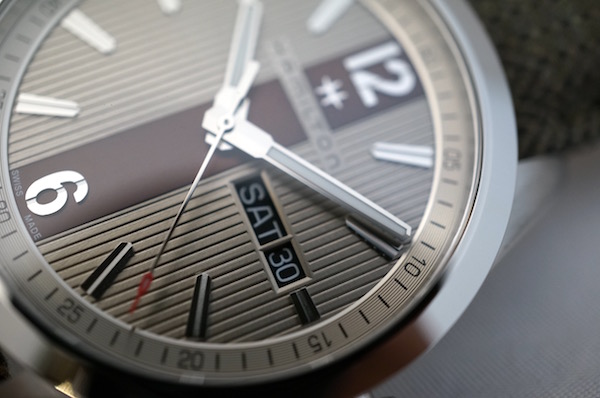 ダイヤルを縦に走るストライプラインがカーフストラップのセンターラインに続き、