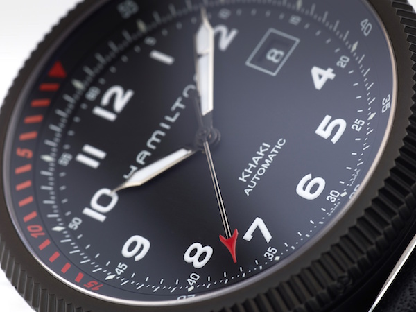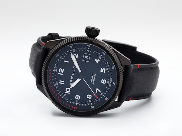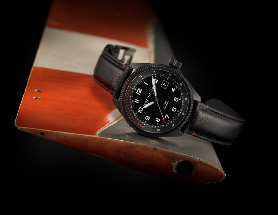 本年は、オールブラックのスタイリッシュな3針モデルへと表情を変えた「カーキ テイクオフ エアーツェルマット」が登場。