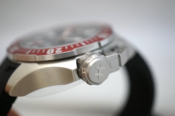 チェーンによって本体に接合された大型防水用のリューズカバーや視認性の高いインデックス。