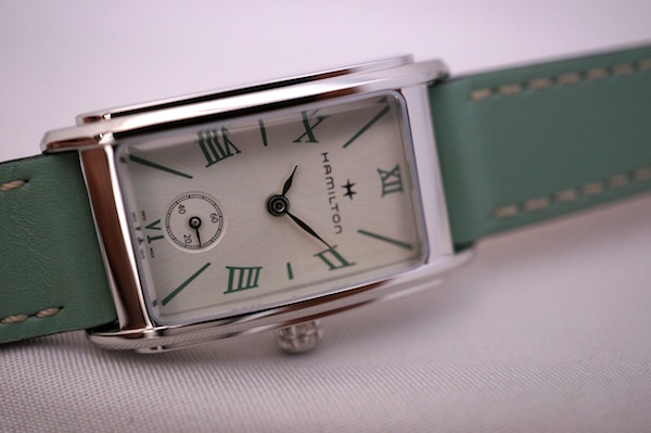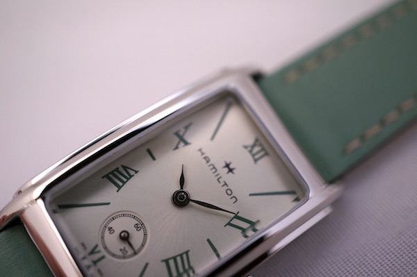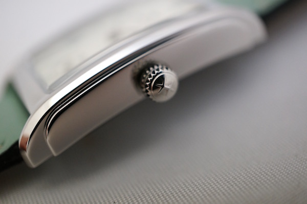 穏やかにラウンドしたスクエアケース、アールデコを基調とした文字盤、特徴的なレイルロードパターンとそれに囲まれたスモールセコンド。