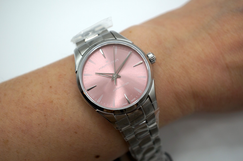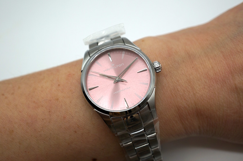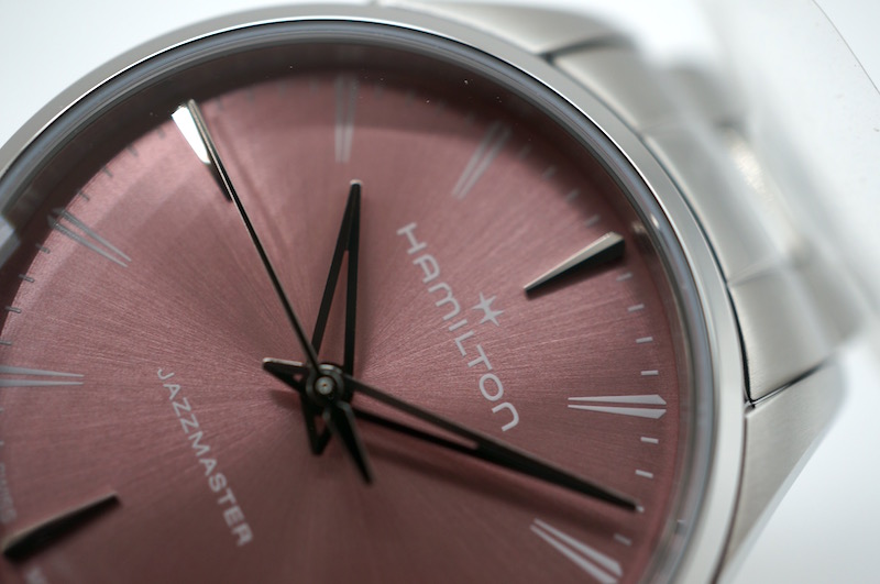 スタイリッシュでフレッシュな「ジャズマスター クォーツ 32mm」は、ダスティローズのサンレイ仕上げダイヤルにスケルトン加工のドーフィン針を採用し、伝統的なスタイルに現代的な解釈を加えています。