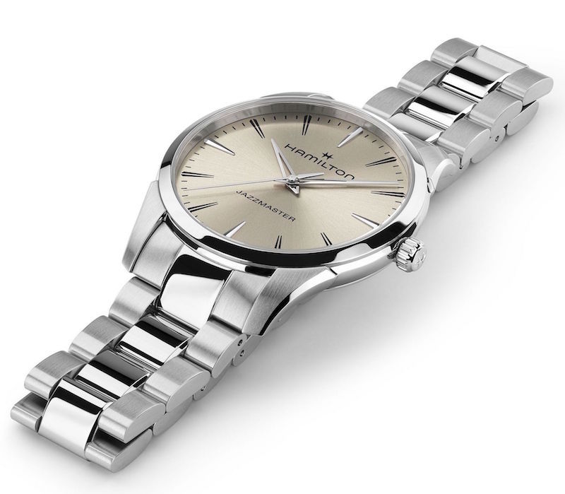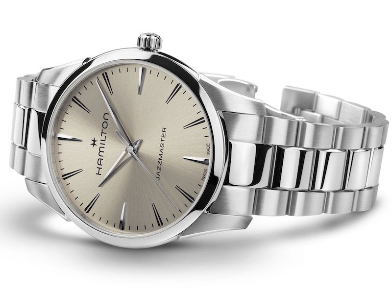 温かみと個性を兼ね備えた「ジャズマスター クォーツ 40mm」は、サンドストーンを思わせる優しいベージュのダイヤルが印象的です。