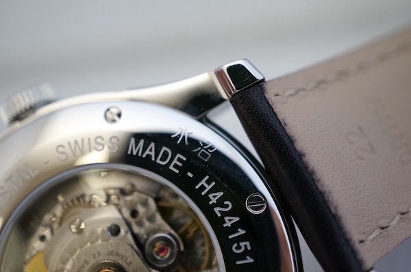 ハミルトン伝統の言葉を革ベルトに記した職人こだわりの時計です。