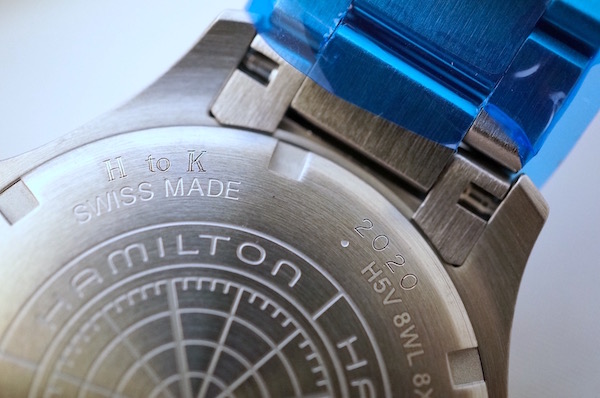 お祝いと記念の時計ですので、裏フタにはランドホーの刻印サービスをご利用いただき世界で一つだけの特別なカーキネイビーの完成です。