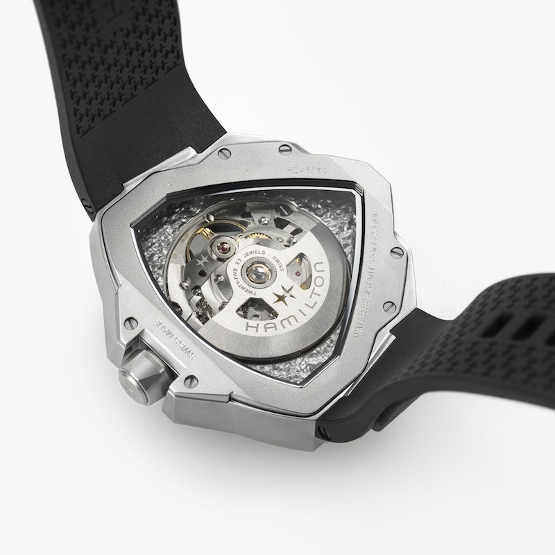 搭載されるのは、ハミルトン社と共同開発を行うスイスETA社製のスケルトン自動巻きムーブメント「H-10-S」。