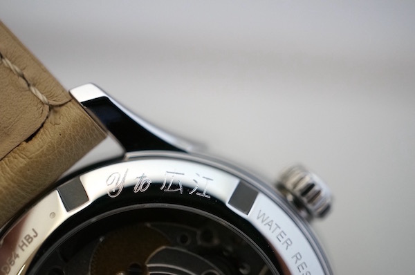 ご購入記念とお祝いに、裏フタには奥様への感謝の内容にて刻印を行いました。