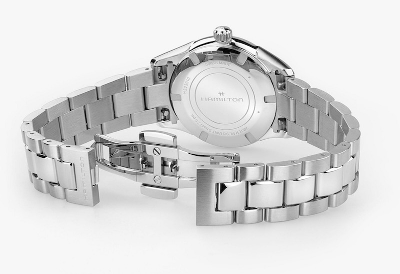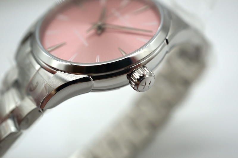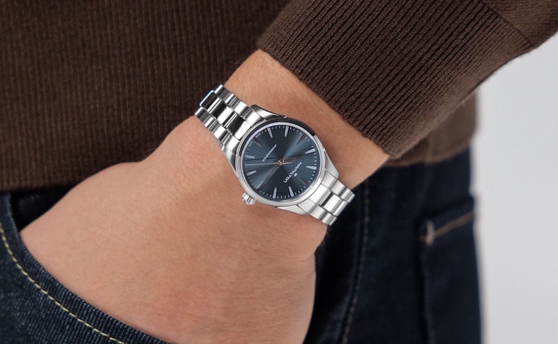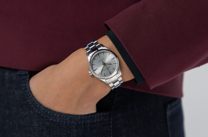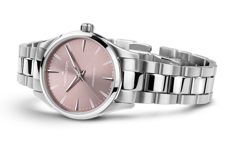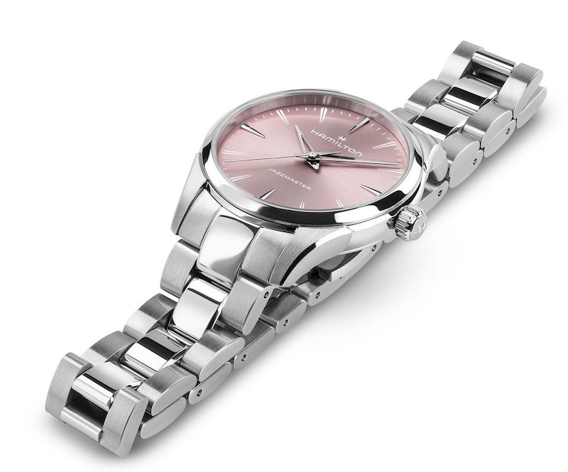 スタイリッシュでフレッシュな「ジャズマスター クォーツ 32mm」は、ダスティローズのサンレイ仕上げダイヤルにスケルトン加工のドーフィン針を採用し、伝統的なスタイルに現代的な解釈を加えています。