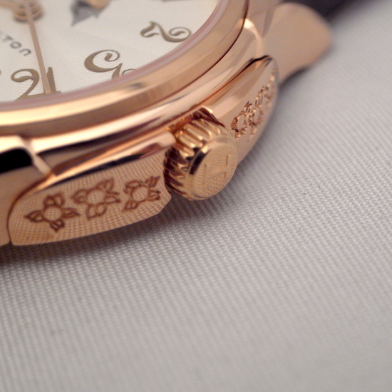リューズカバーには、お花の彫りを。
