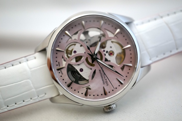 特徴でも有るベビーピンクMOPのダイヤルから、ムーブメントのルビーがノーブルに覗く、ジャズマスタービューマチック スケルトン レディ。