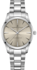 温かみと個性を兼ね備えた「ジャズマスター クォーツ 40mm」は、サンドストーンを思わせる優しいベージュのダイヤルが印象的です。
