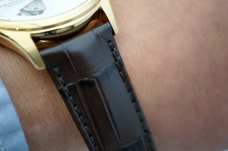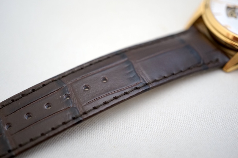ピンクゴールドケースと相性の良いダークブラウンのクロコダイルプレスカーフベルト。