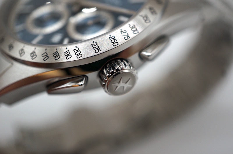 ねじ込み式リューズのデザイン、プッシュボタンのデザインと操作性の良さが自慢です。