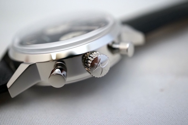 自動巻きのローターがなくカレンダーレスのためケースは薄型で、手巻き操作やプッシュボタンの操作で機械式腕時計の感触や動きをシンプルに楽しめるかと思います。