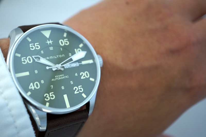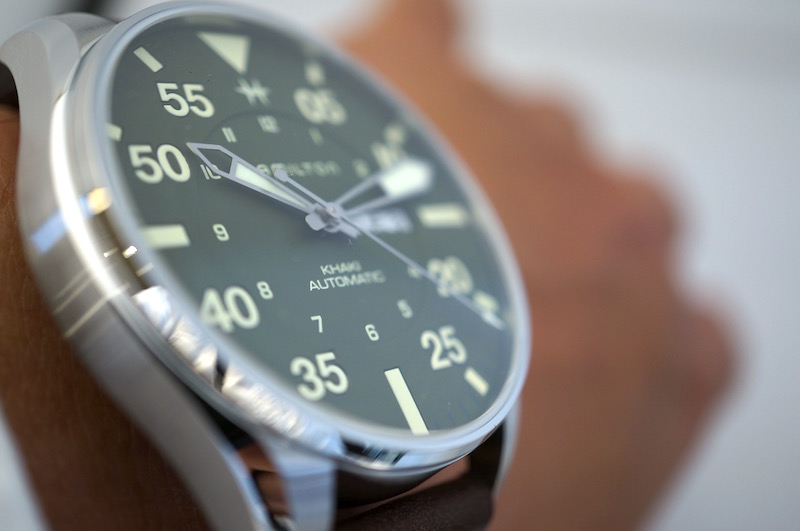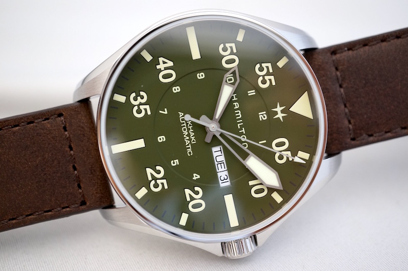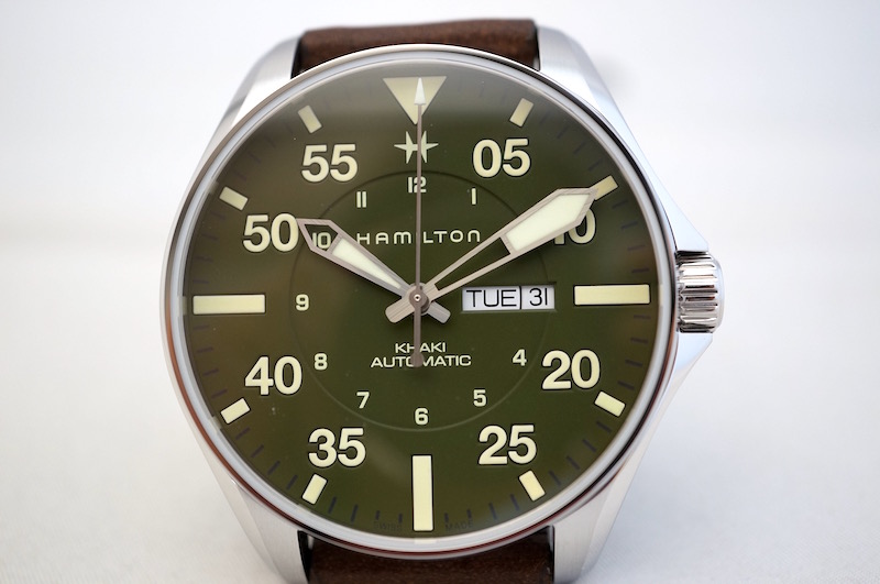 46ミリのパイロットウオッチサイズのケースに標準持続時間80時間のH-30自動巻きデイデイトムーブメントを搭載。
