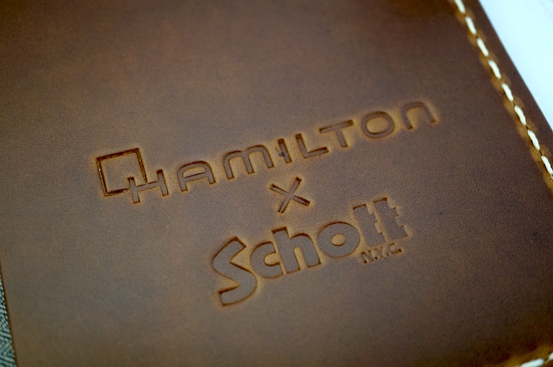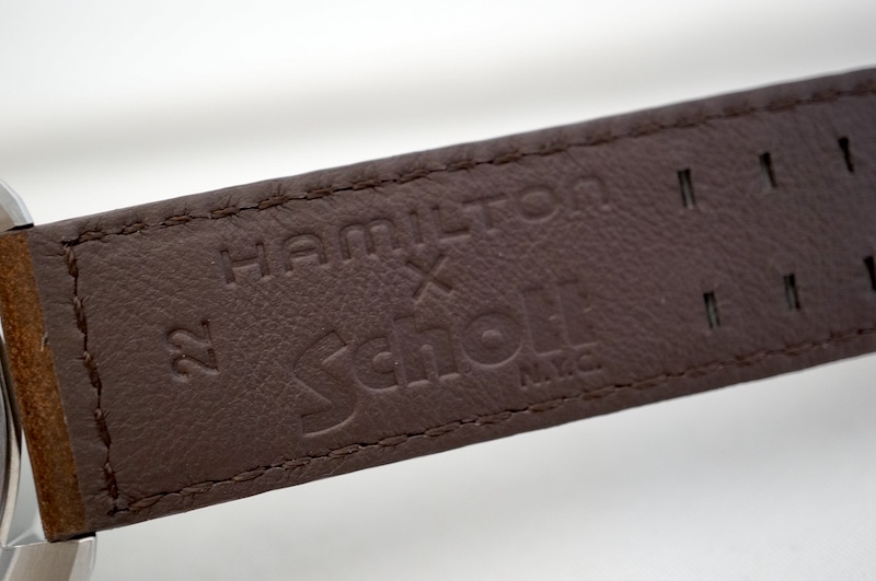 ベルトの内側には両社の記念のハミルトンとSchott NYCのロゴが刻印されています。