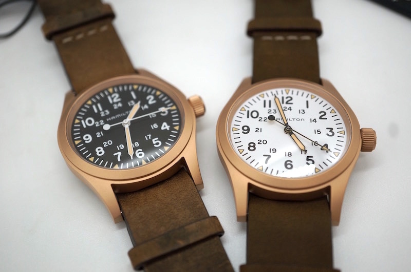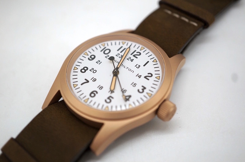 新しい「カーキ フィールド メカ ブロンズ」は、38mm径の待望のホワイトダイアルを備え、軍用規格を踏襲する24時間表記のインデックスと3針を採用。