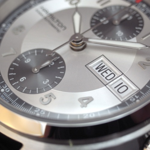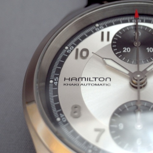 マットシルバーの文字盤にグレーの縁取りがハミルトンならではのセンスの良さです。