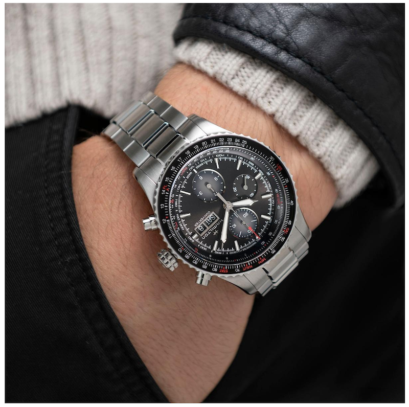 44mmのケースに、耐磁性に優れたシリコン製ヒゲゼンマイを採用したH-21-S自動巻きクロノグラフムーブメントを搭載。