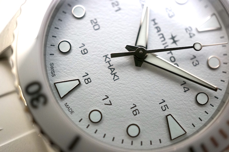 カーキネイビーでは初のセラミック製のベゼルを採用することにより、傷や腐食に強く岩や砂、海水の影響を受けにくい仕様になっています。