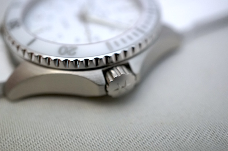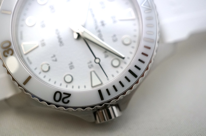 ホワイトダイヤルにホワイトのセラミックベセルをあわせたクオーツモデル。