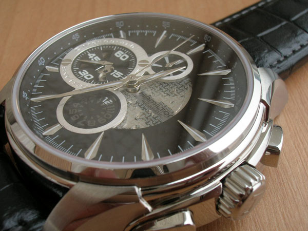 6時位置の12時間計は、サブダイアル全体が回転し、その表面のスモークガラスの窓が